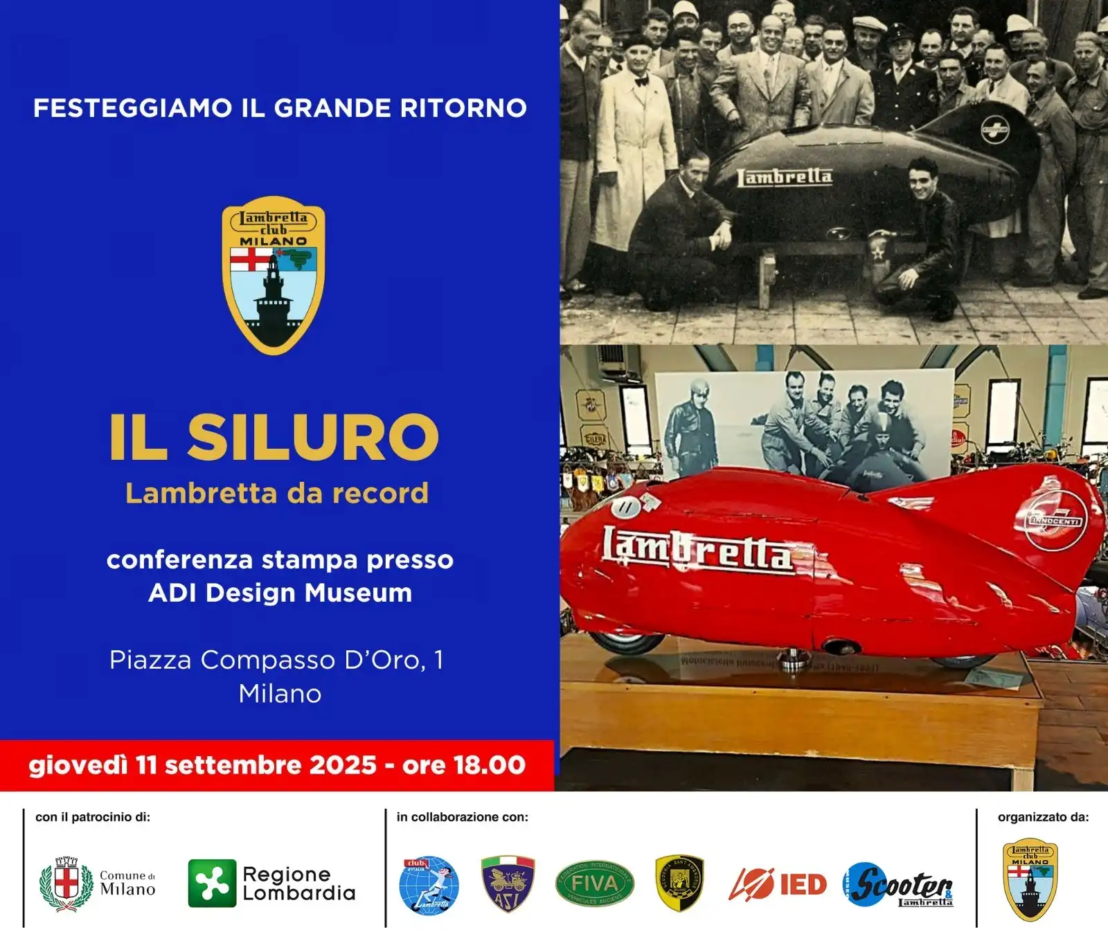Giovedì 11 settembre, dalle ore 18, presso l'ADI Design Museum in Piazza Compasso d’Oro 1 a Milano, si svolge la serata evento per celebrare il ritorno a Milano del leggendario mezzo da record “SILURO”, prodotto dalla Innocenti alla fine degli anni ’40.